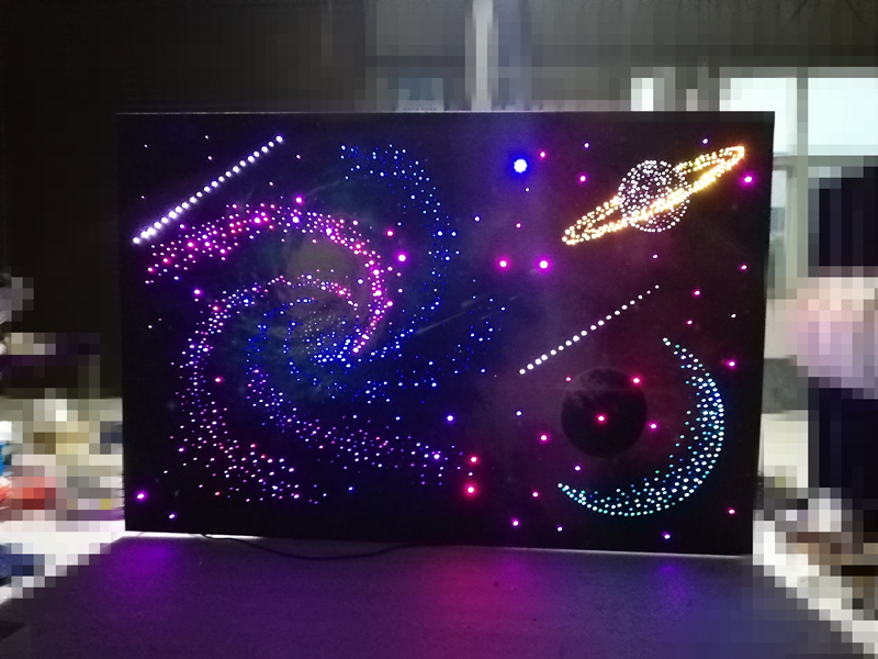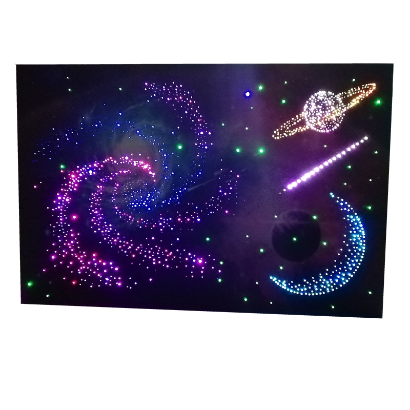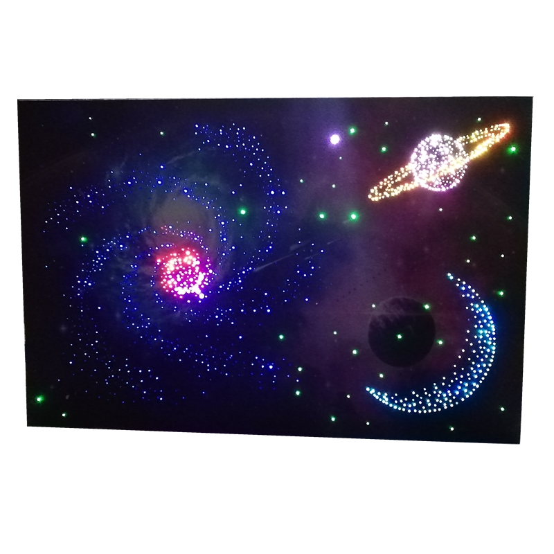 星空顶是用光纤做为导光材料,用光源模块控制发光,可以订制不同图形,发光颜色可以有多种变化模式,可用于房顶面装饰,户外灯光展览等。